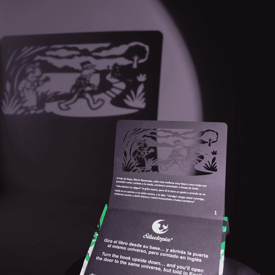 Este no es solo un libro; es una puerta a la imaginación. Con solo una linterna (¡la de tu celular es perfecta!), cada página troquelada se convierte en una escena mágica. Las sombras del Rin Rin Renacuajo, el amigo ratón y doña rata danzarán en la habitación, creando un recuerdo imborrable justo antes de dormir.